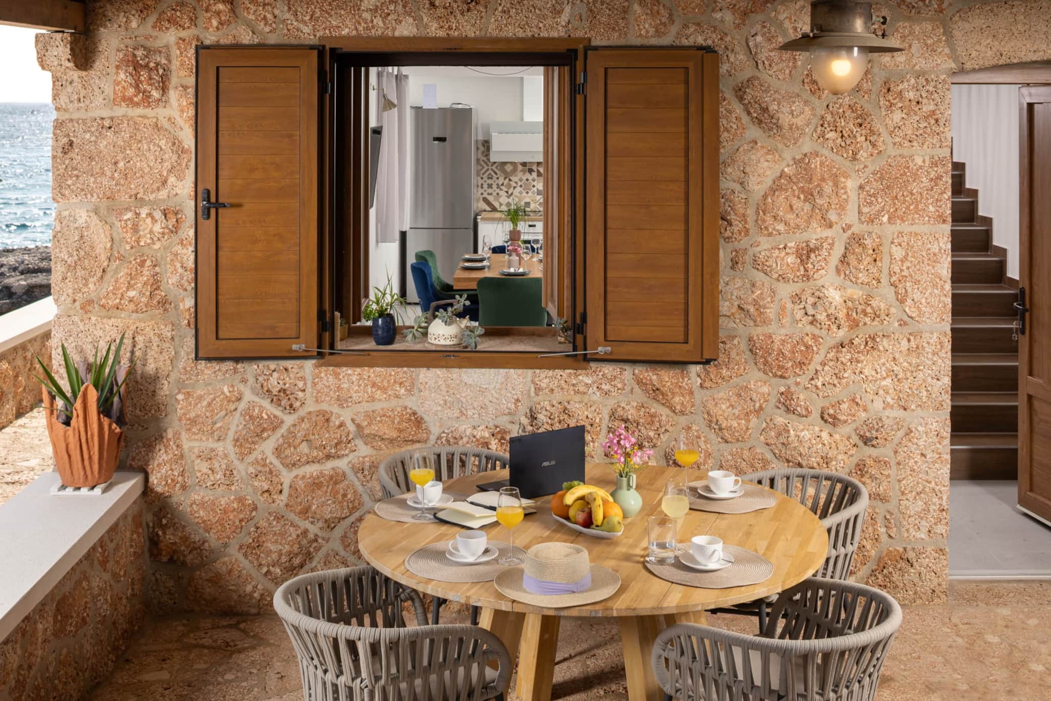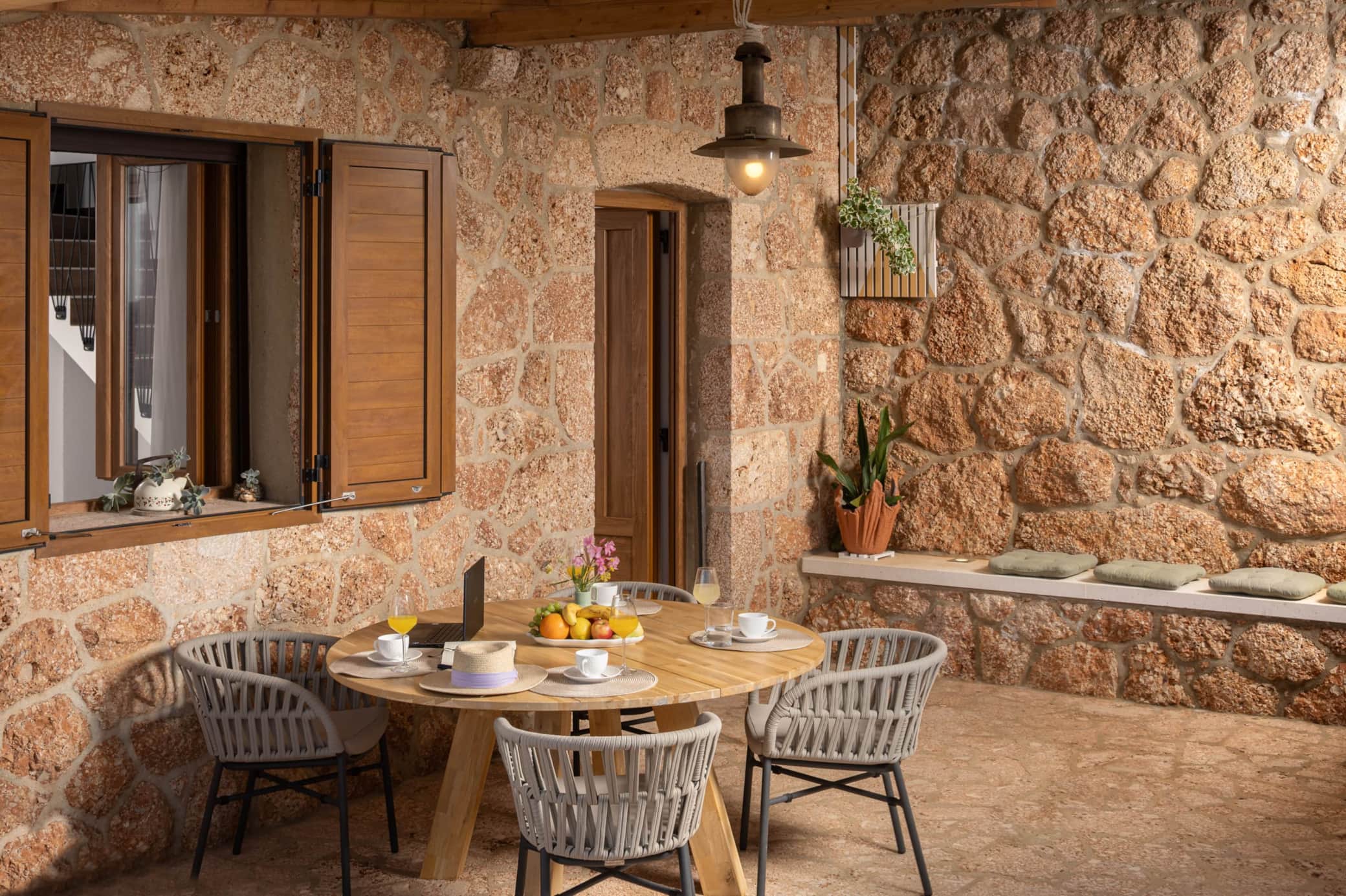 The house features two comfortable bedrooms and a fully equipped modern kitchen that opens into a cozy living and dining area. The interior blends historic stone charm with contemporary design, suitable for up to 4 guests, though curated specifically for couples seeking intimacy.