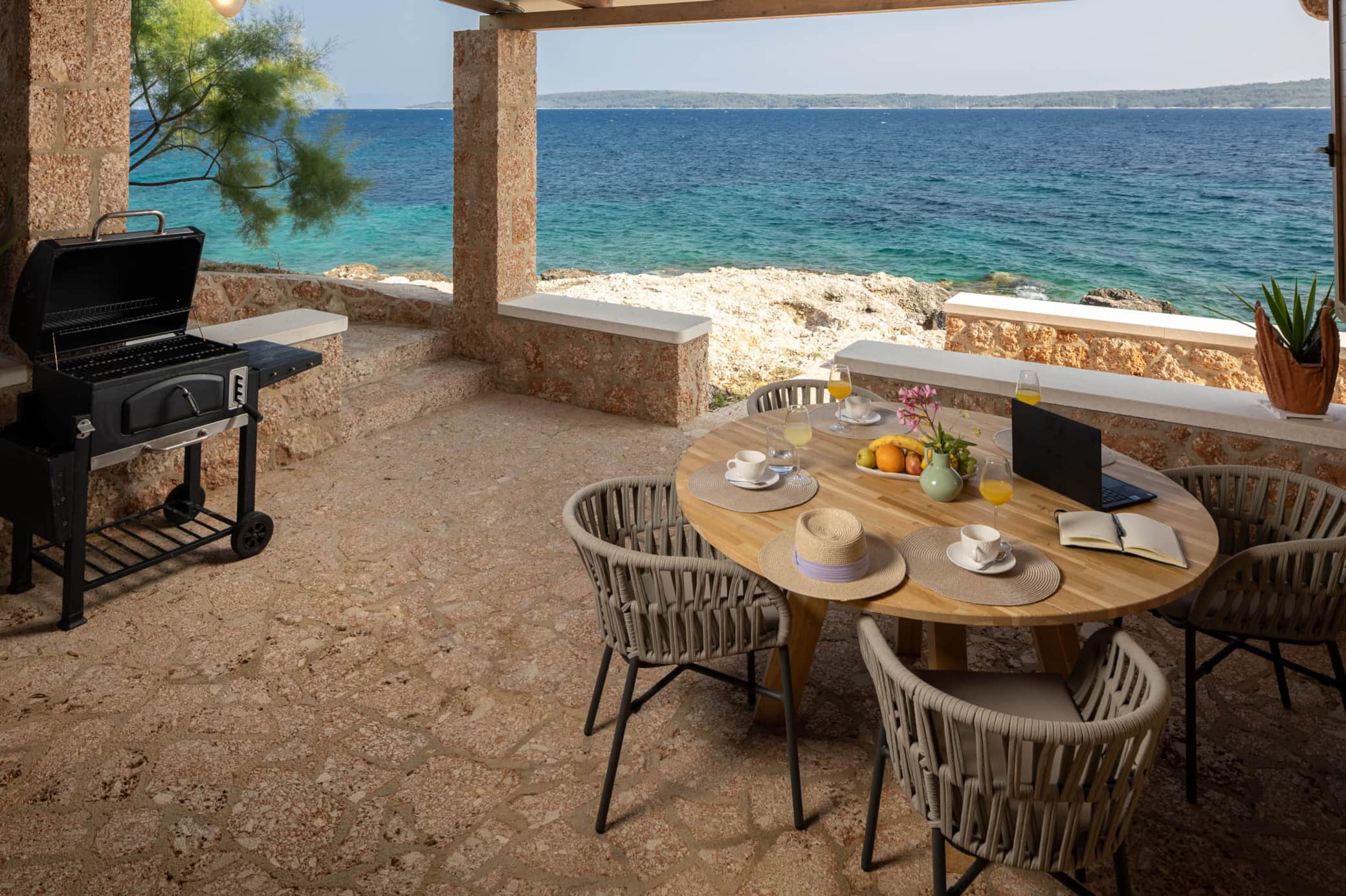 Outdoor Living: Life at Bogić Kuća is lived outdoors. Enjoy two distinct private terraces: a sun-drenched front terrace with panoramic sea views and a BBQ grill for alfresco dining, and a shaded back terrace perfect for a quiet afternoon with a book.